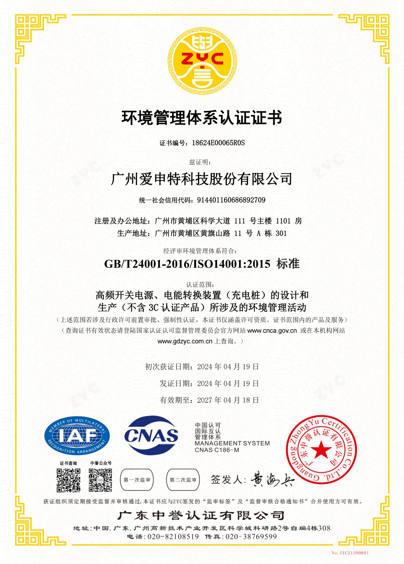 環(huán)境管理體系認證證書