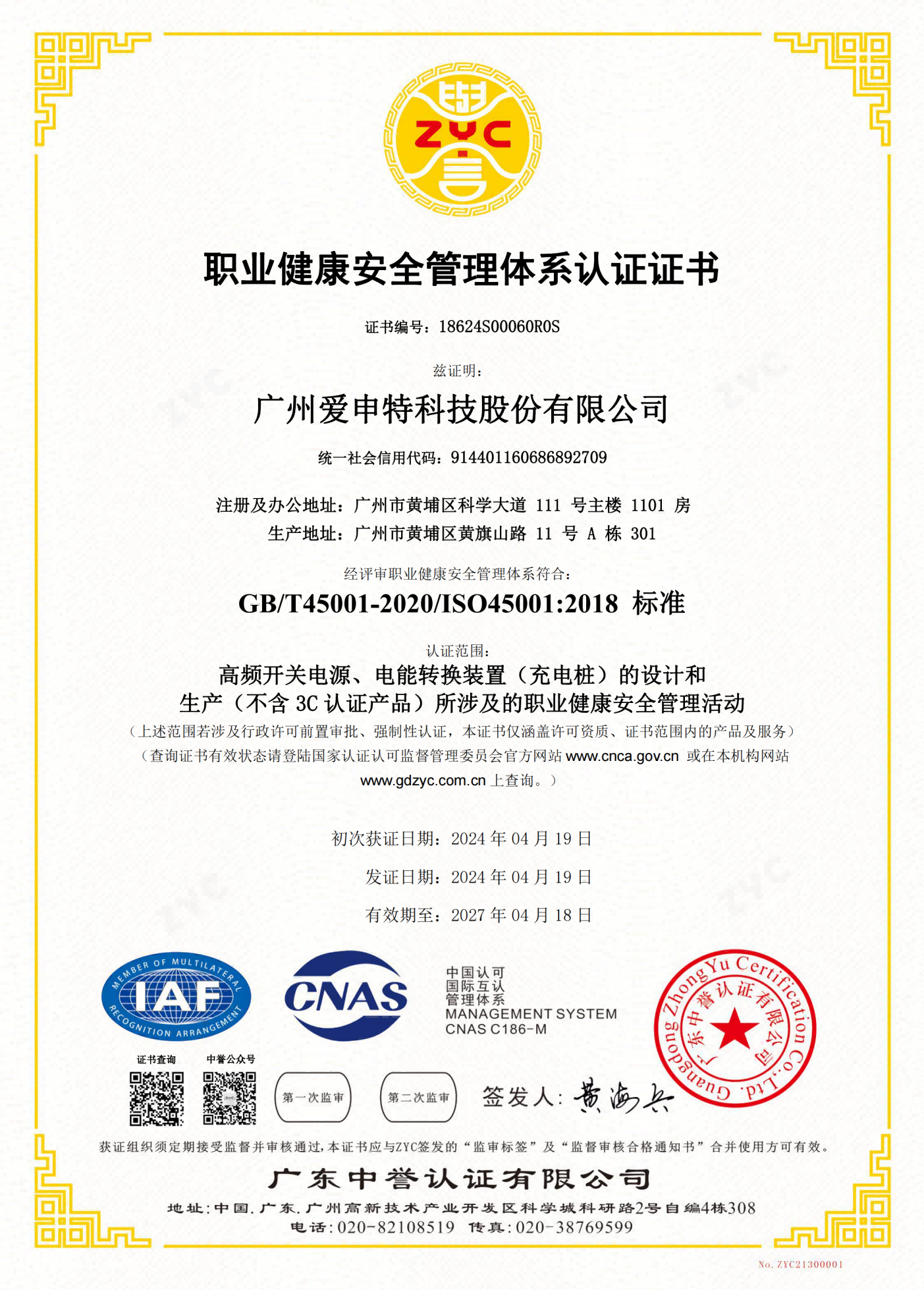 職業(yè)健康安全管理體系認證證書