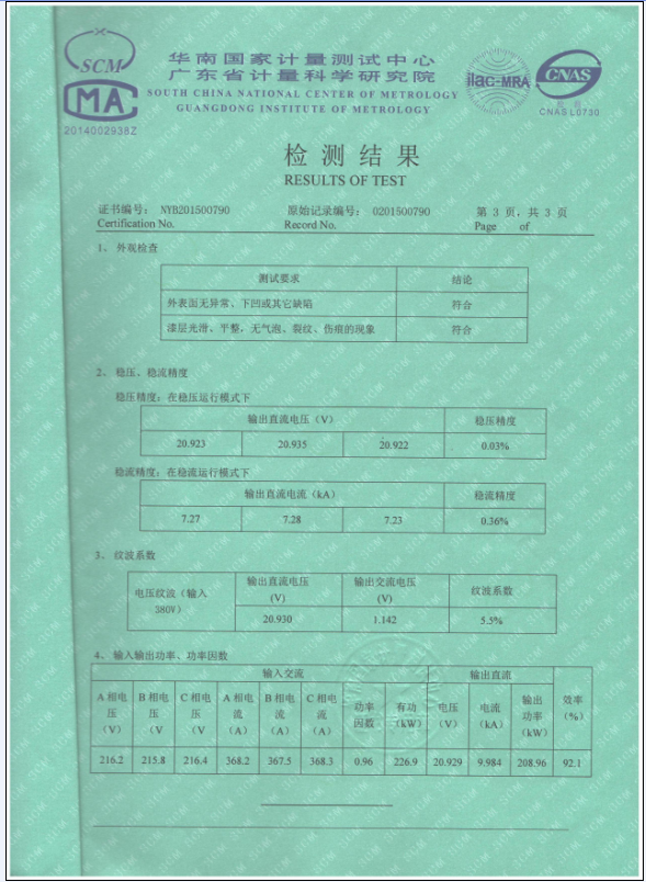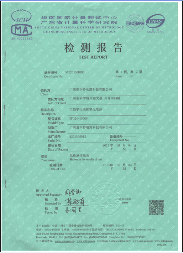 熱烈慶祝我司全數字化高頻氧化電源通過華南國家計算測試中心廣東省計量科學研究院檢測,檢測證明我司產品確實比同類產品高效、節能。
